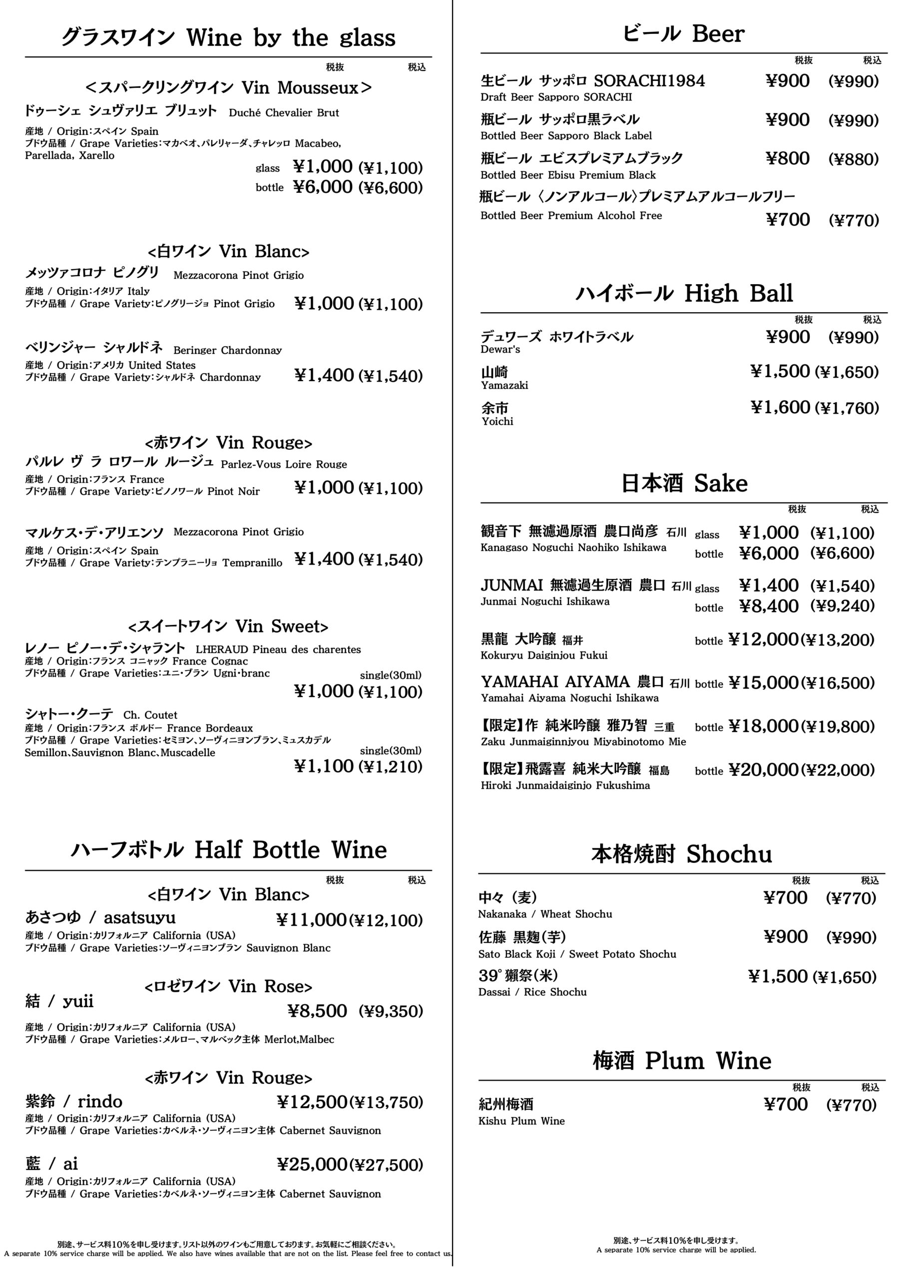 - Half Bottle 8,500円(税込9,350円)