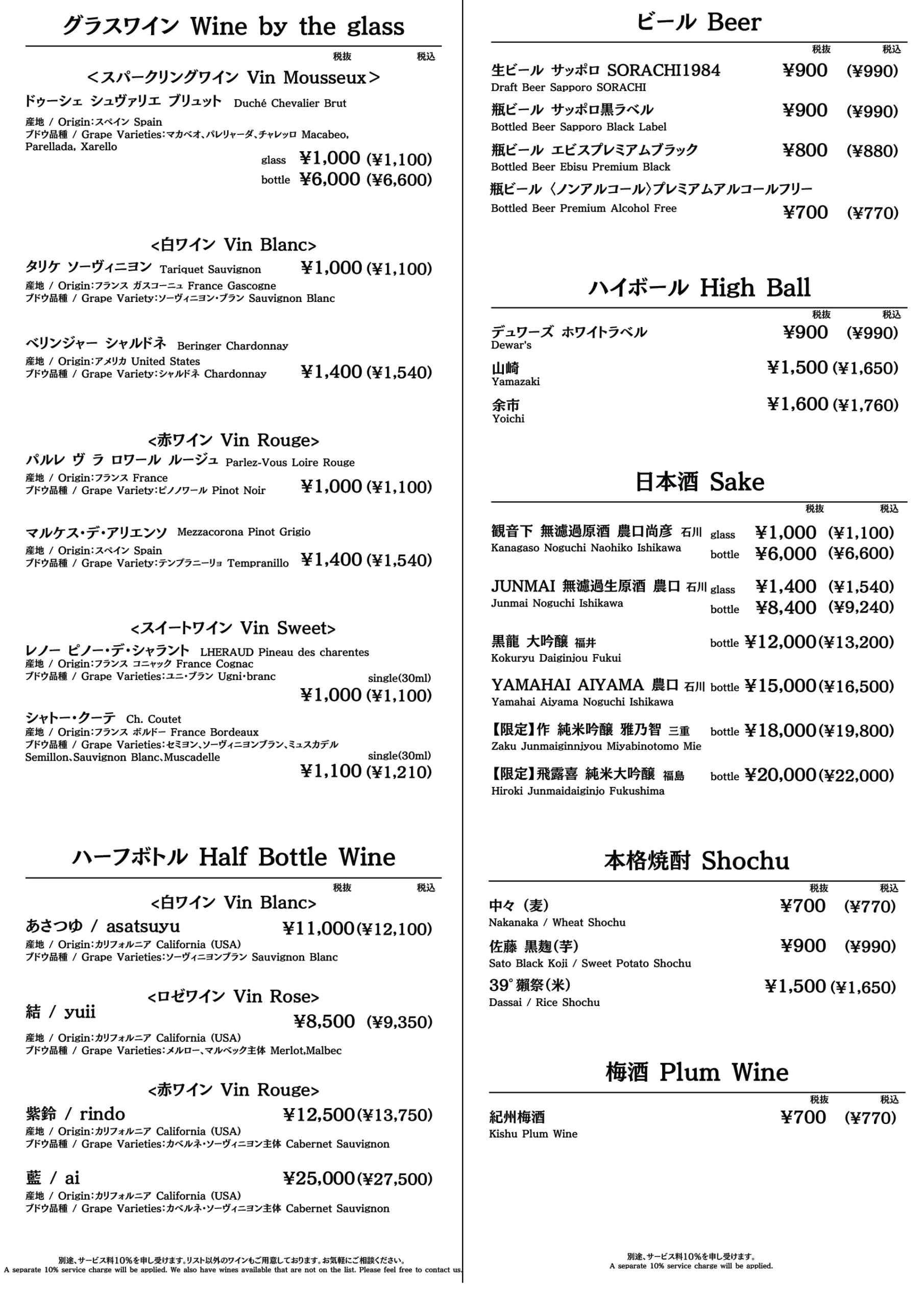 - Half Bottle 8,500円(税込9,350円)